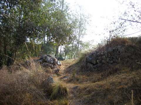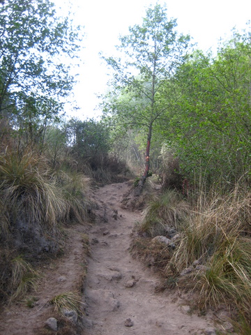 this dirt road passes a few houses, and ends and becomes trail in a couple hundred yards. from there, continue up on steep hardpacked dirt until you hit the road, cross it, adn continue up on trail. this takes 20-40 minutes walking, depending. it crosses teh road about halfway up. again, estimating from memory. the trail is less scenic, as you only have views of dusty trees, or of xela (which between the city air and the neblina, you wont see much a lot of the time). however, its quick, fun, etc. there are a few small animal trails and drainages that criss-cross the trail, but none of them will distract you. the routefinding is a cinch.