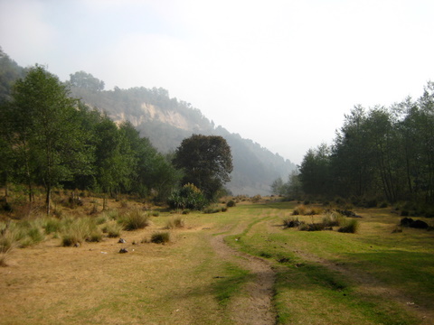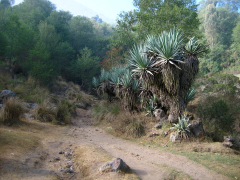 take this up for five or ten minutes. youll see a big conifer looming up ahead, where the road bends left. that;s where you're heading. youll get to a big gas station on your left, the big tree is in front of you on the right side of the road (ascending). take the little road that shoots up and right there. pass a tienda on the right, and then wind your way up a road with very little traffic save a few bikes and the occasional van packed full of commuters. after a little while walking up this road, youll get to a sign for some hot springs (im told these are quite nice), and a road that leads to the springs on the right (a hard turn, almost doubling back and steeply uphill). ignore this offshoot (or hit it on the way down?) and keep going on your road, around a wide bend to the left as it hugs a drainage in the hills, and then keep a sharp eye out for a dirt trail shooting up off the road to the right.