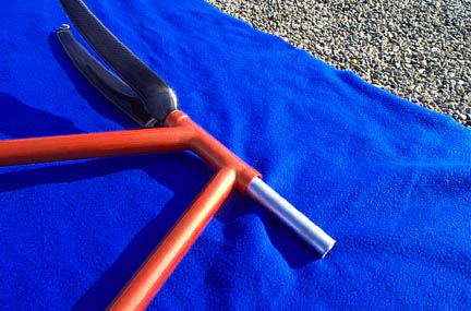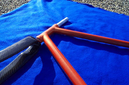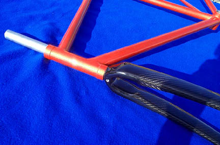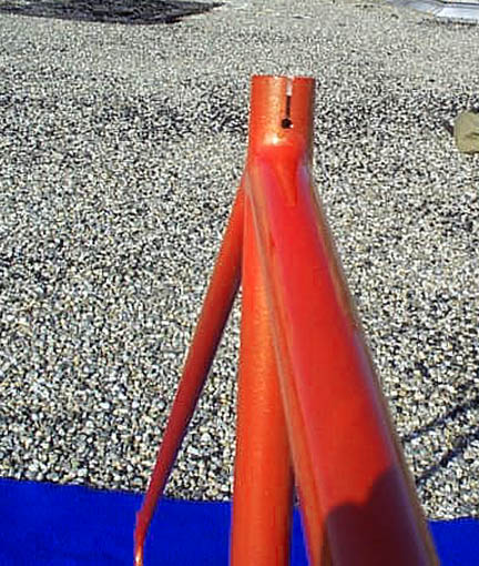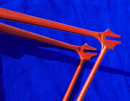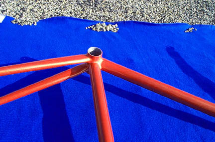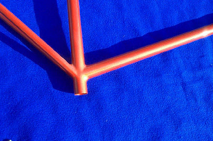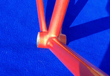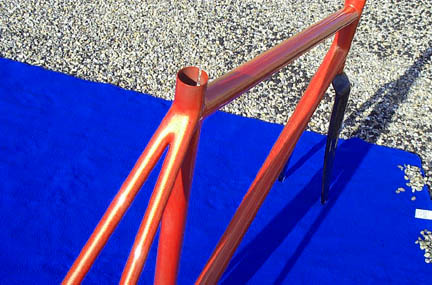 frame is double-butted thinwall steel. dropouts are homemade from 1/4" steel plate. paint is dupont vine red base with gold pearl on top and candy clearcoat.